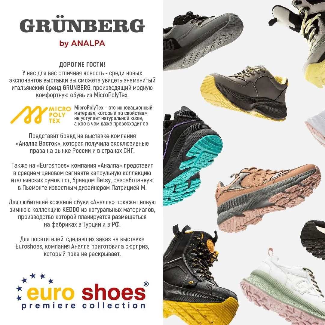 Analpa после перерыва вновь примет участие в выставке Euro Shoes которая пройдет 1-4 марта в Main Stage. Среди новых экспонентов выставки вы можете увидеть знаменитый итальянский бренд Grundberg, производящий модную комфортную обувь из MicroPolyTex.