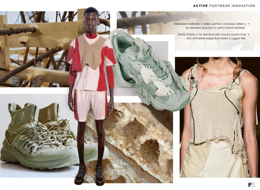 Протертые материалы и потускневшие тона отражают непринужденный подход к спортивной обуви.