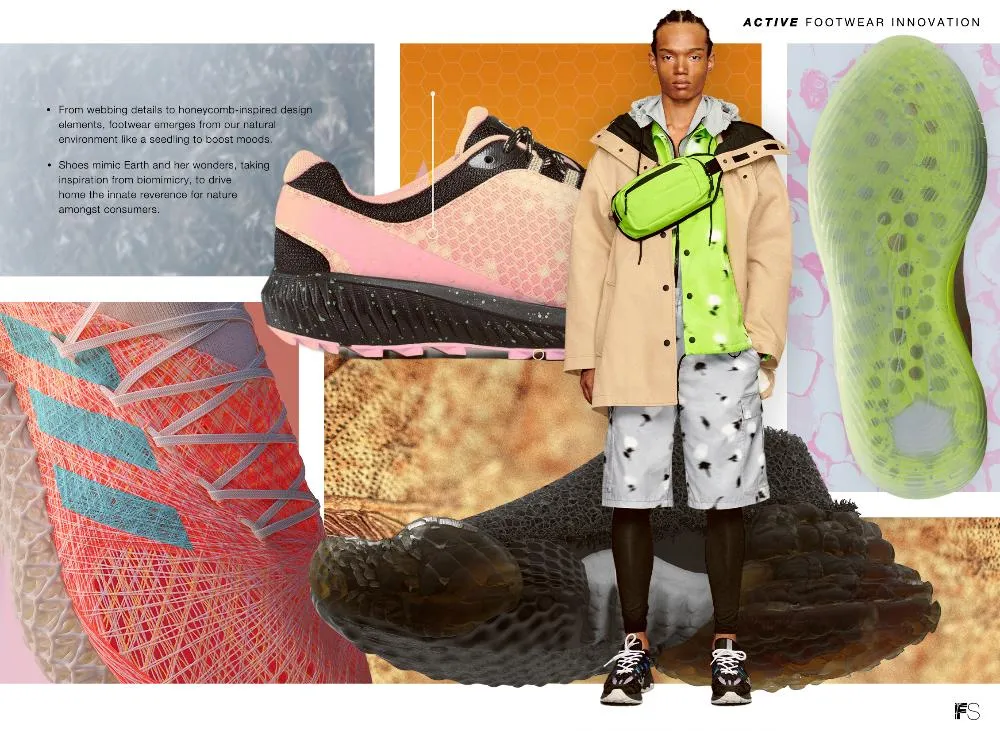 В дизайне обуви используются элементы биомимикрии (подстройка под внешнюю среду живых организмов): обувь как кокон, изменение верха обуви под полноту, пронация стельки под индивидуальные особенности стопы или прямые отсылки к природным элементам. Например, рисунок сот, материалы наподобие природной губки.