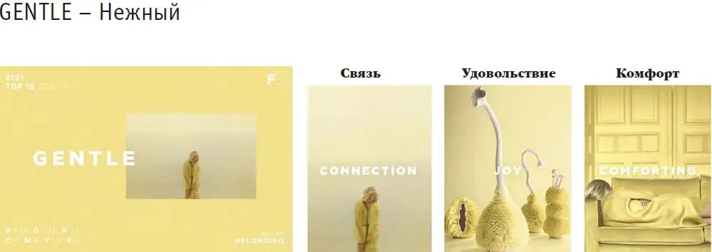 Gentle – свежий, стойкий цвет, являющийся новой эволюцией Generation Z («Поколения Z»), при этом выглядит как веселый и привлекающий внимание. Gentle олицетворяет естественную радость, которая служит спасательным средством от окружающего хаоса. Светло-желтый оттенок Gentle наполнен ощущением нежности, комфорта, взаимосвязи и радости.