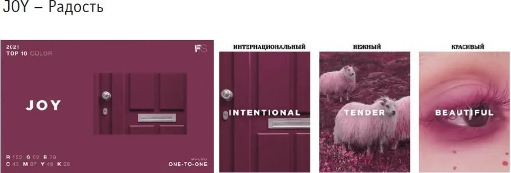 Joy, идеально балансирующий между женским и мужским цветом, - один из самых насыщенных оттенков 2021 года. Со всеобъемлющим мышлением, смещающимся от новизны к действительно необходимым вещам, этот оттенок демонстрирует силу универсальности через вдумчивость и переосмысление роскоши. Существует постоянная битва однообразия и активного личного выражения, и данный оттенок стремится соединить эти две противоположности. Приглушенный насыщенный малиновый цвет никогда не остается незамеченным. Этот цвет олицетворяет нежность, интернациональность, красоту.