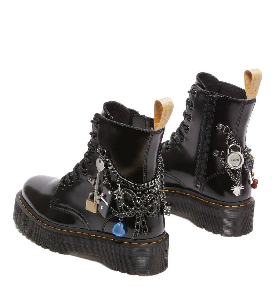 Модель Jadon Boots создана по мотивам культовых «мартенсов» 90-х гг. – золотого времени британского бренда. Почерк Marc Jacobs в юбилейных Jadon Boots заметен в причудливых подвесках и шармах, которые заметно выделяются на фоне глянцевой кожи глубокого черного цвета.