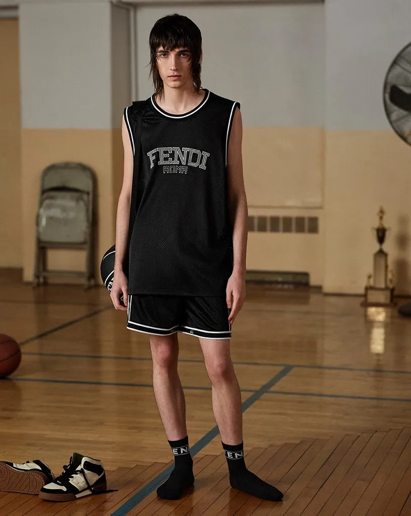 Линия одежды представлена баскетбольными футболками, майками и шортами, в черно-серой палитре, со спортивной ребристой окантовкой Fendi Roma. Серый ансамбль из спортивного костюма и университетской куртки-бомбера из легкой технической ткани имеет контрастную черную окантовку, напоминающую линии баскетбольного мяча, и узор с логотипом FF в тон на рукавах и по бокам.