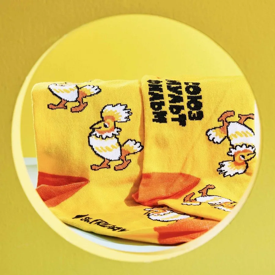 На принтах сета «Тайна Третьей планеты» тоже персонажи второго плана. В бокалах на модели с Громозекой не вино, как может показаться по цвету, а чистая валерьянка. Ровно 400 капель – все как в мультике. Робот с планеты Шелезяка, на которой нет ни растительности, ни полезных ископаемых, ни воды, изображен вместе со своими шестеренками и лампочками. А птица Говорун, отличающаяся умом и сообразительностью, и без дополнительного антуража отлично смотрится на носках ярко-желтого цвета. Зверино-птиче-рыбий рынок вдохновил на создание сразу двух моделей: голубых носков с загадочными существами индикаторами, меняющими цвет по настроению, и бирюзовых с летающей коровой Склисс. Мультяшному злодею посвящена одна пара – Весельчак У изображён вместе с его фирменным пистолетом.