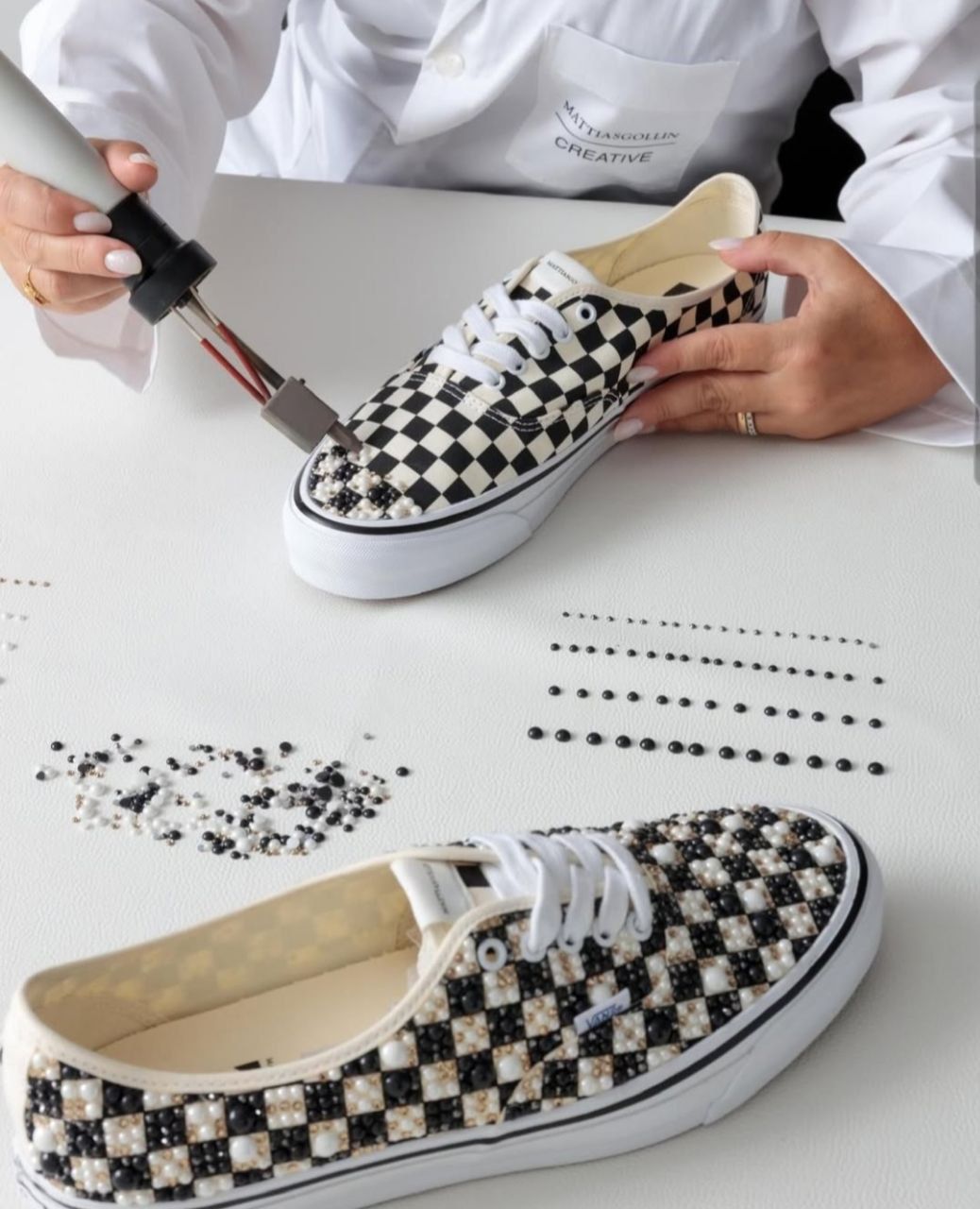 Дизайнер Маттиас Голлин использовал около 2000 жемчужин и камней для превращения пары кед Vans Authentic из продукта масс-маркет в уникальное произведение.