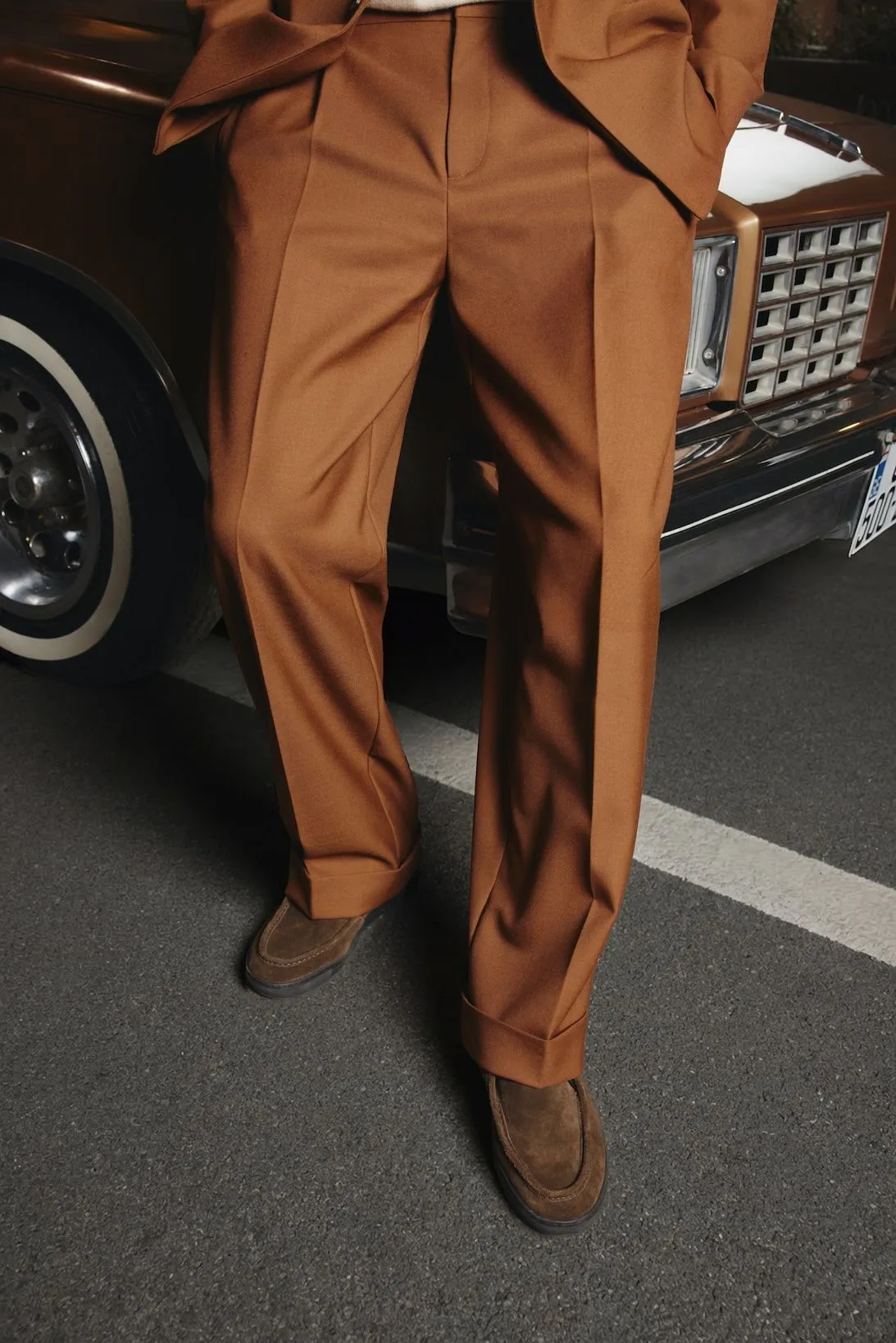 Мужская коллекция включает 23 предмета гардероба: верхнюю одежду, костюмы из шерстяных тканей, трикотаж и деним. Линейка построена вокруг лаконичных форм, сдержанной цветовой палитры с акцентами и сочетает классические элементы мужского гардероба с современными пропорциями и материалами. Обувь представлена классическими лоферами и полуботинками из натуральной коричневой замши.