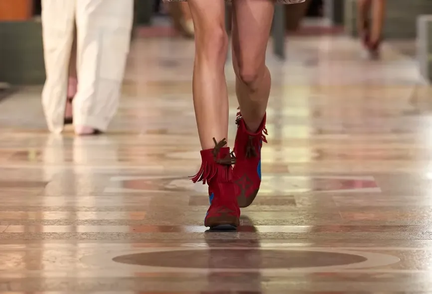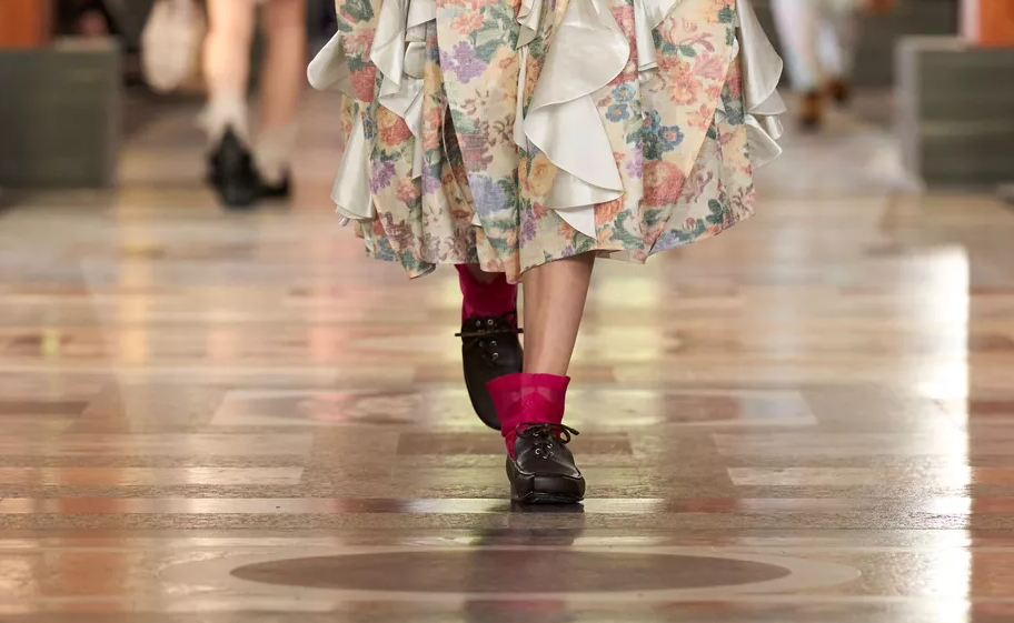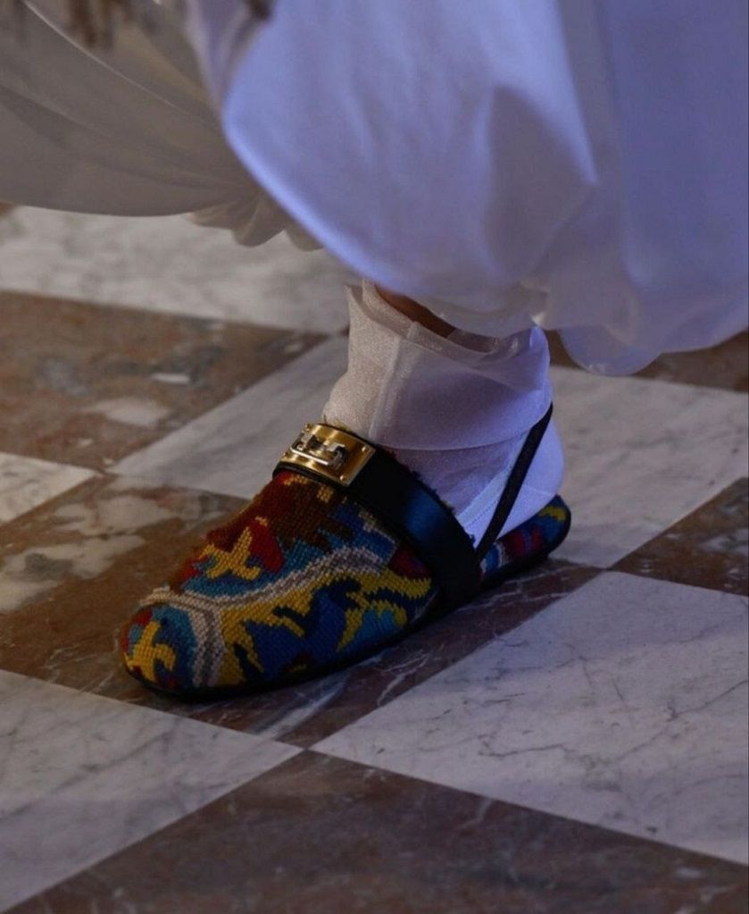 В коллекции Louis Vuitton весна-лето’26 домашние тапочки обретают новое прочтение за счет интересных цветовых решений и сочетания с носками из неожиданных шикарных материалов, как например, расшитой серебром парчи, шифона, золотистого шелка.