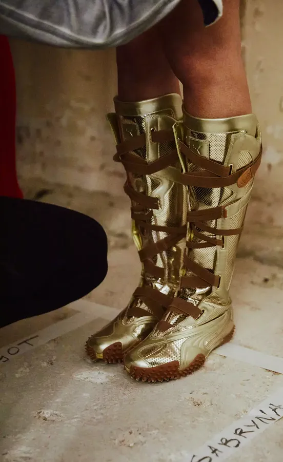 На показе верхняя одежда со свисающими трубками и рваные платья Ottolinger смешались со свежими интерпретациями хитов бренда, таких как солнцезащитные очки Twisted и керамические сумки. Обувь из капсулы Ottolinger x Puma на этом фоне выглядела также достаточно фантастично. Силуэты варьировались от кожаных высоких ботинок до позолоченных сапог до колен с шипованной подошвой и ремешками. С плеч моделей свисали лакированные сумочки со смелыми принтами «Ottolinger» и ко-брендингом Puma и Ottolinger на лямках и боковых панелях.