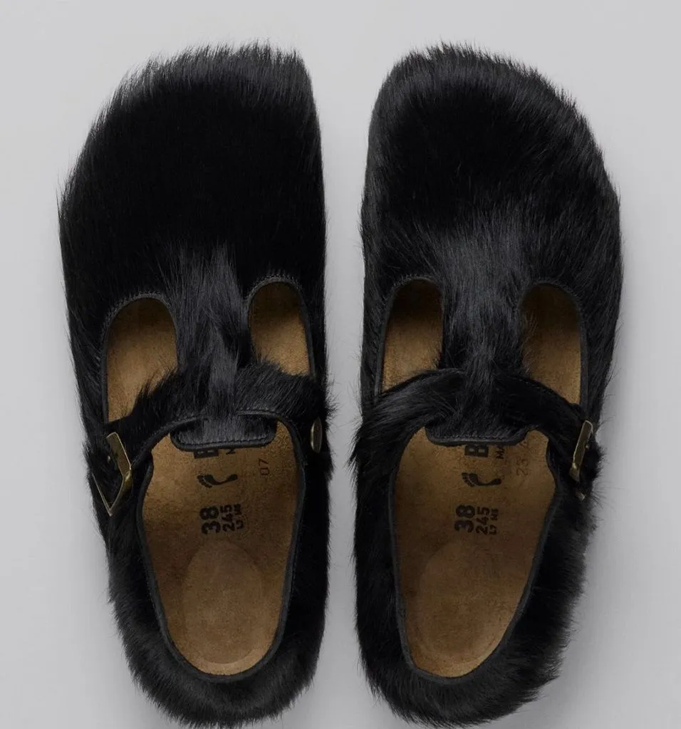 Сандалии Бунтарь выпущены в силуэте Париж с верхом из шкуры пони в черном цвете.